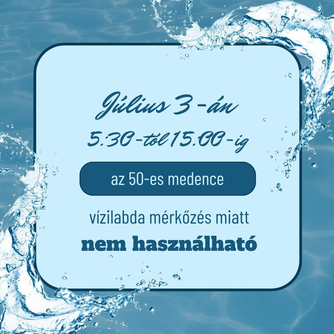 Kedves Vendégeink!📅 Július 3-án (csütörtökön) 5:30-tól 15:00-ig, az 50-es medence nem lesz használható vízilabda mérkőzés miatt.Köszönjük megértéseteket! 💙A többi medencénk zavartalanul üzemel.